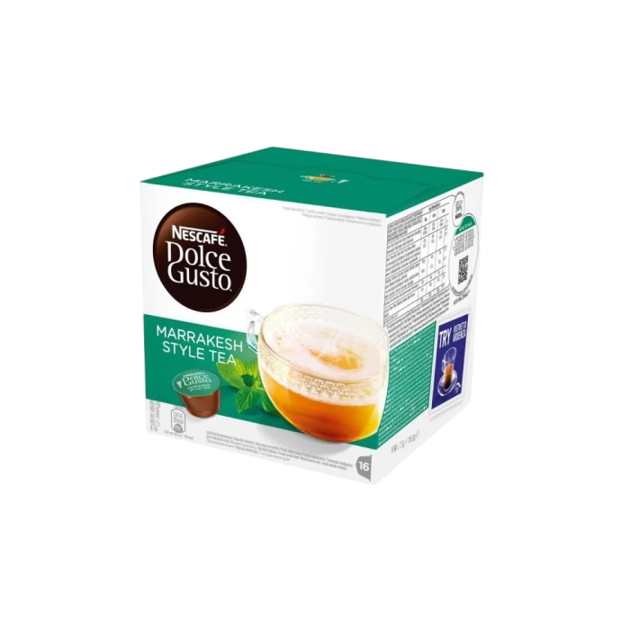 Marrakesh thee is de intens muntige en heerlijke frisse smaak van Marokko. Deze thee heeft de smaak van groene thee en munt met een schuimlaag. De Dolce Gusto Marrakesh Style Tea bevat 16 consumpties per verpakking.
