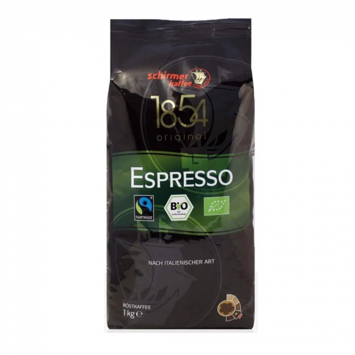 De Schirmer Bio Fairtrade Espresso is biologische koffie, voorzien van Fairtrade en Bio keurmerk. Schirmer heeft hiervoor een melange gebruitk van pure hoogland Arabica bonen, zorgvuldig gebrand middels een heteluchttechniek. De Fairtrade/ Transfair organisatie ziet toe op het welzijn van de producerende koffieboeren voor deze Espresso. De voor de Schirmer Kaffee Espresso gebruikte koffiebonen zijn afkomstig van kleinere koffieboeren, welke zorgvuldig en zonder bestrijdingsmiddelen hun plantages bewerken. Het duitse BCS-instituut heeft deze melange voorzien van een keurmerk en ziet toe op de zorgvuldige naleving van de gestelde richtlijnen. Schirmer heeft deze donkere Arabica melange een donkere branding gegeven, waardoor een aangenaam stevige smaak is ontstaan met een mooie ronde afdronk. De stevige smaak maken het ook een goede basis goede basis voor Cappuccino’s of Latte Macchiato’s.